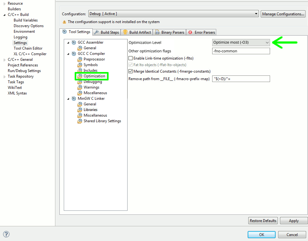 Après avoir créé le nouveau projet (vérifier qu'il est présent dans l'arborescence à gauche), ouvrir la fenêtre des propriétés du projet : Projet > Propriétés. Dans la section C/C++ Build > Settings > GCC C Compiler > Optimization : choisir le niveau d'optimization -03 ("Optimized most").