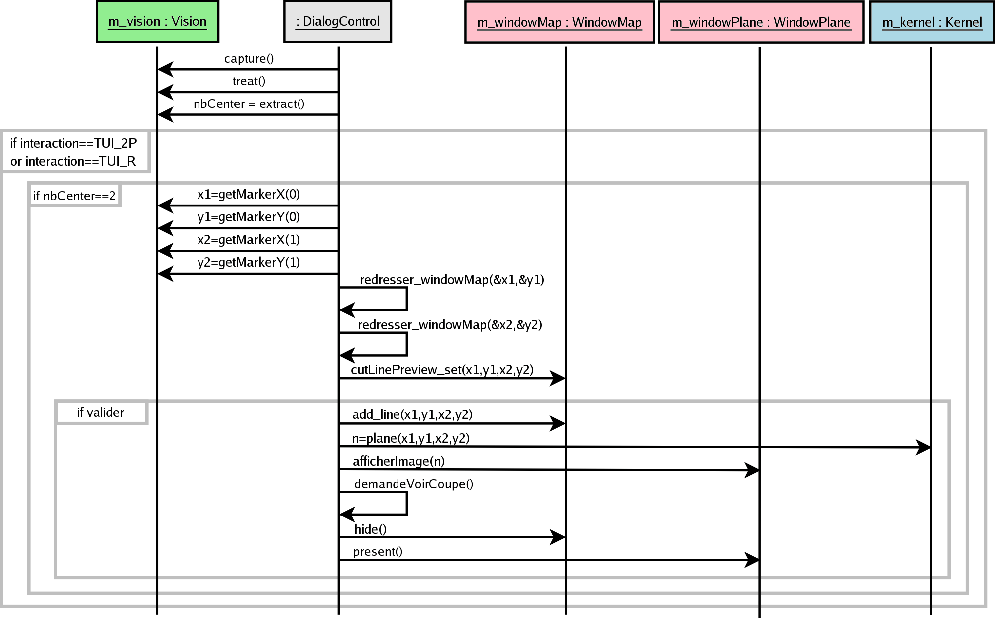 GeoTUI works as a frontend that analyses user actions from video frames, sends commands to a backend through a socket connection, and displays the images received back from the backend. This software was involved during two user experiments (a 8-hour session on 2006-07-24 and a 9-hour session on 2007-03-06), exhibited during five academic and industrial events (from 2006 to 2008), and showcased to dozens of lab visitors.